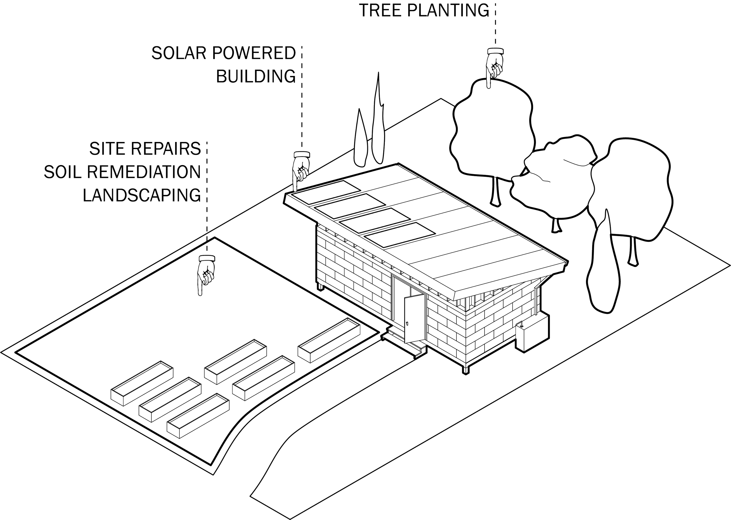 In the construction phase, our vacant lot will be activated with site repairs, soil remediation, landscaping and tree planting, and the erection of a small, off-grid storage and distribution facility built using sustainable design strategies from natural materials and powered by solar electricity. The tool library will be built by volunteers, and its design and performance will be documented and shared for replication and study.